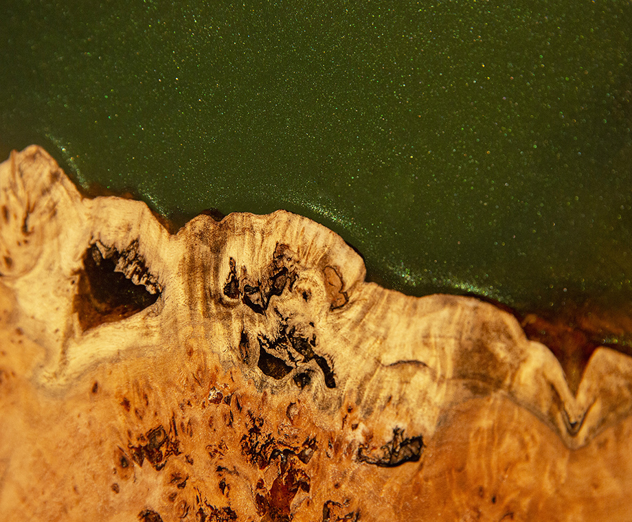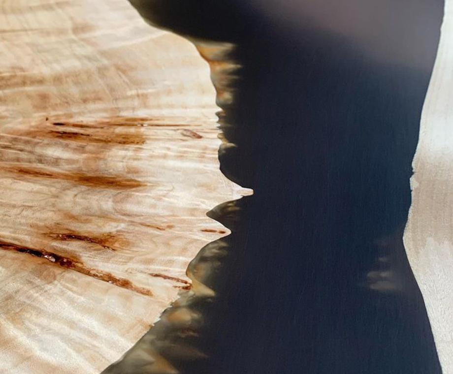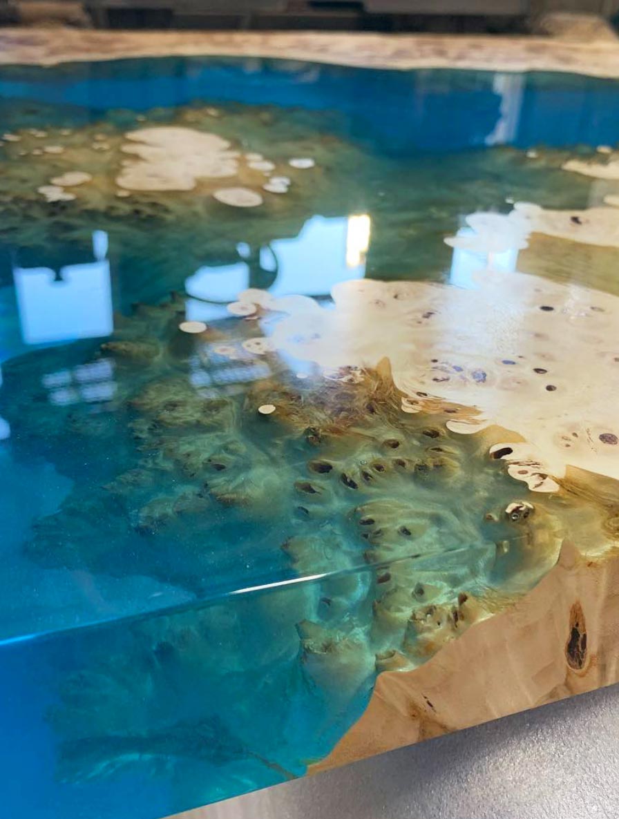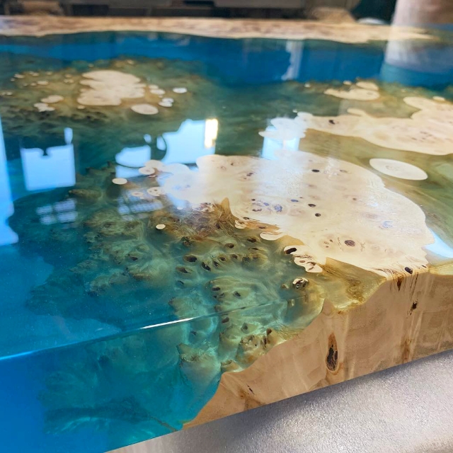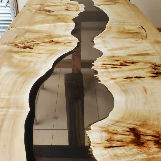 レジンテーブルとは、主に無垢板と、エポキシ樹脂の流し込みを組み合わせた、テーブルの事を言います。使用する無垢板によって様々なデザインが可能ですし、合わせるエポキシ樹脂の色によって異なる風合いが楽しめるテーブルです。