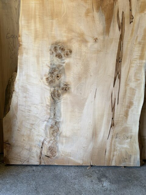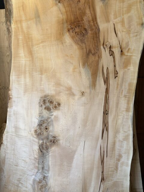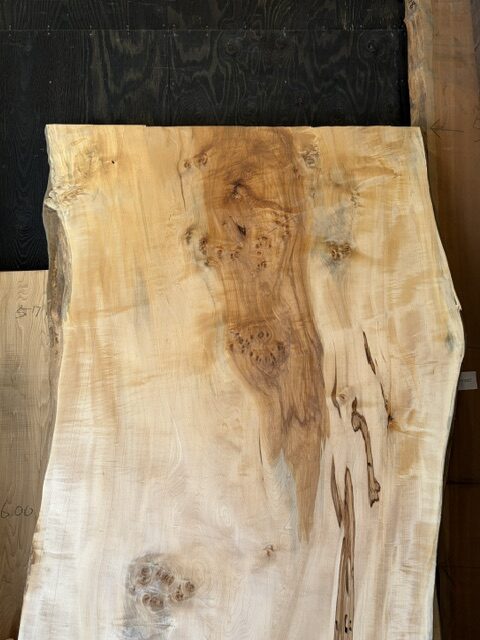 栃の一枚板です。黄白色のキレイな色合いの中に、部分的な赤身や縮杢・瘤杢、スポルテッドが現れている表情豊かで美しい一枚板です。